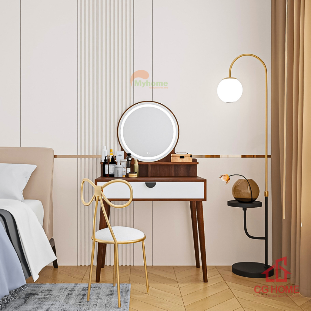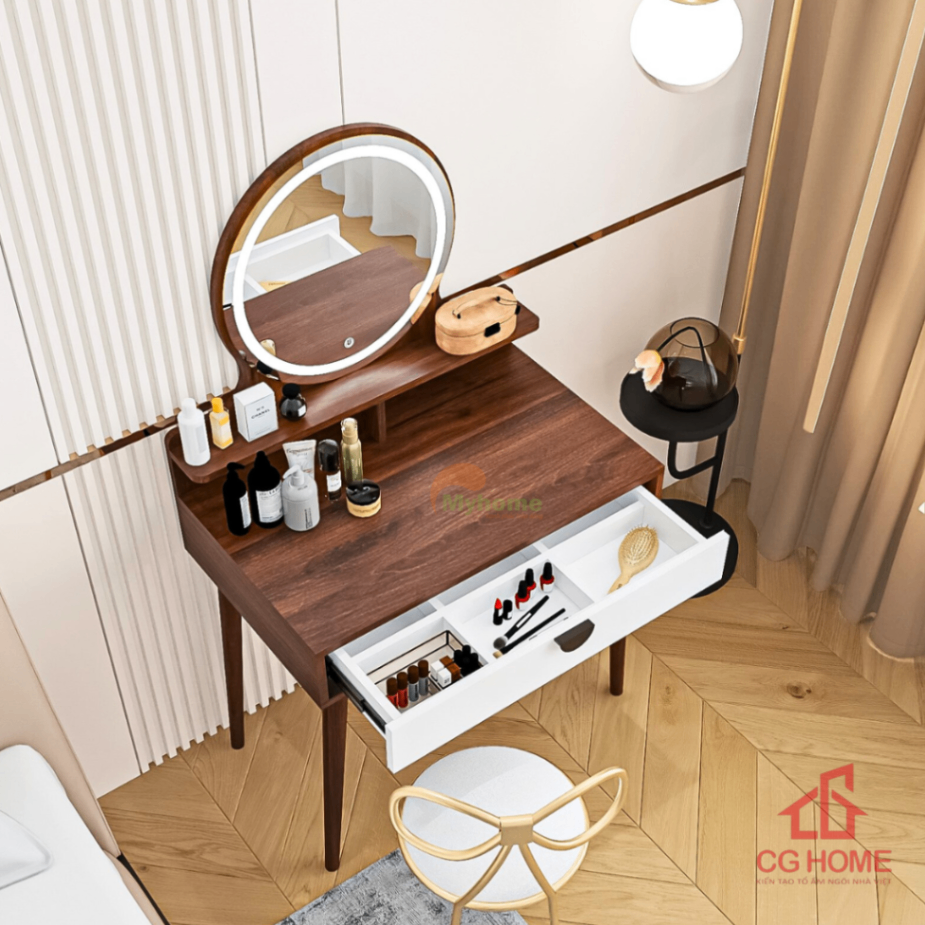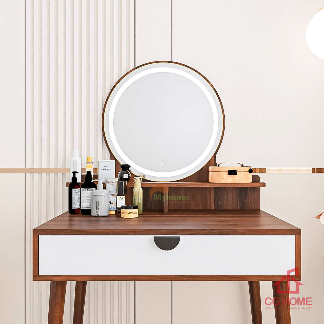 Bàn trang điểm không chỉ là nơi để makeup mà còn là một phần quan trọng trong bố cục nội thất phòng ngủ. Mẫu bàn trang điểm gương tròn hiện đại dưới đây được thiết kế theo tiêu chí đẹp – tiện – gọn, phù hợp với nhiều phong cách và diện tích khác nhau