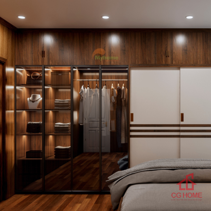 Tủ quần áo thường được thiết kế âm tường hoặc kịch trần. Giải pháp này giúp tối ưu diện tích phòng ngủ. Cánh tủ phẳng tạo cảm giác hiện đại và gọn gàng. Tay nắm âm giúp bề mặt liền mạch hơn.