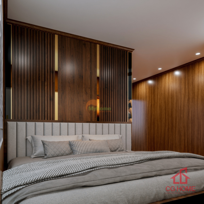 Phòng ngủ hiện đại sang trọng với gam gỗ trầm, mang lại cảm giác ấm áp và thư giãn