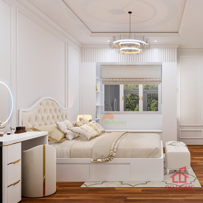 Không gian phòng ngủ tân cổ điển hiện đại với bố cục cân đối, gam màu trắng – be chủ đạo