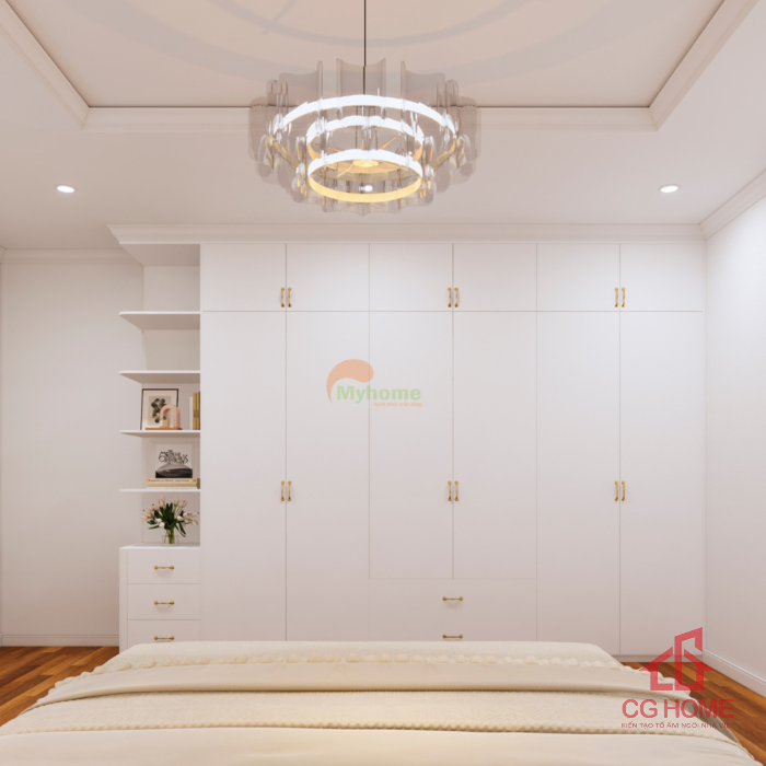 Hệ tủ quần áo kịch trần màu trắng giúp tăng không gian lưu trữ