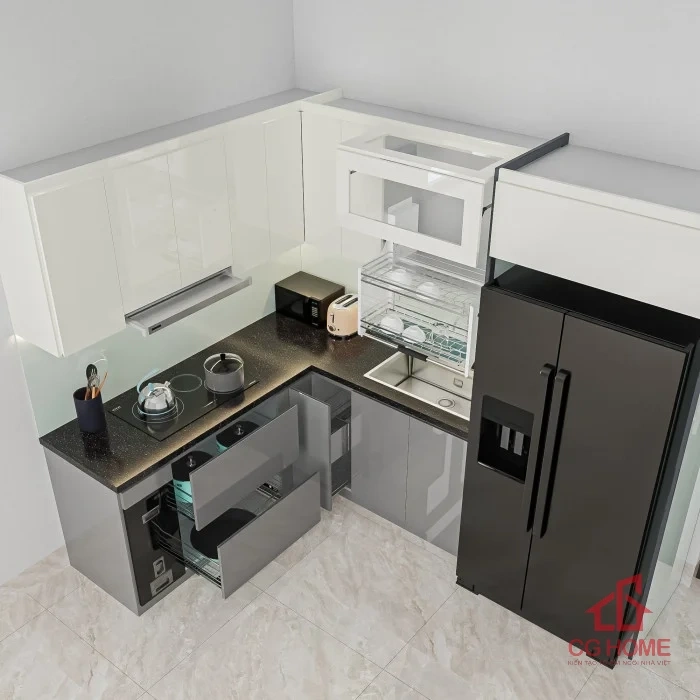 - Tối ưu không gian: Thiết kế chữ L tận dụng góc bếp, phù hợp với mọi căn hộ hoặc nhà phố.