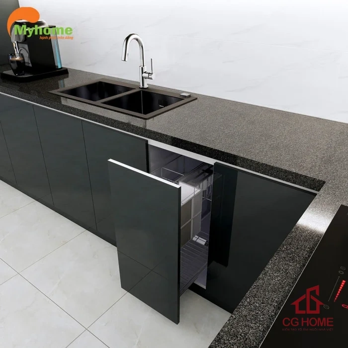 Ngoài ra tủ bếp còn được tích hợp các loại phụ kiện thông minh: