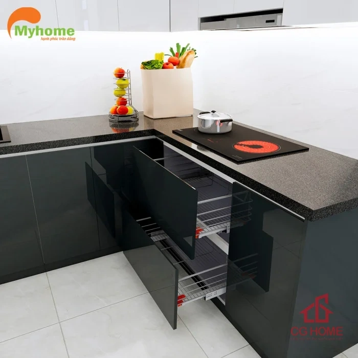 - Tối ưu không gian: Thiết kế chữ L tận dụng góc bếp, phù hợp với mọi căn hộ hoặc nhà phố.