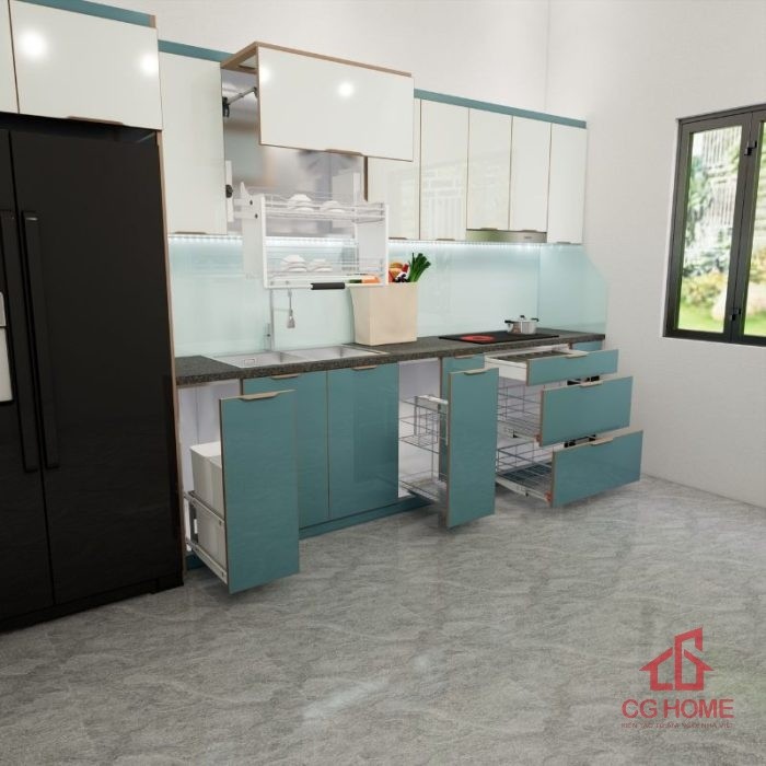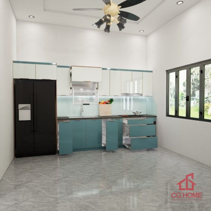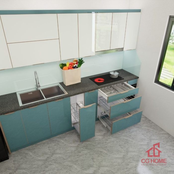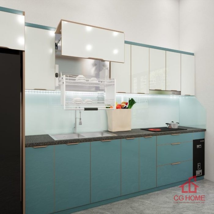TRANG CHỦ / SẢN PHẨM / TỦ BẾP / TỦ BẾP INOX CÁNH KÍNH / Mẫu tủ bếp inox cánh kính 3.9m chữ I mầu trắng xanh