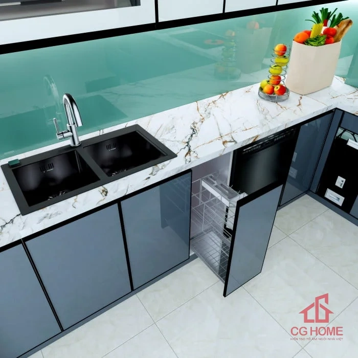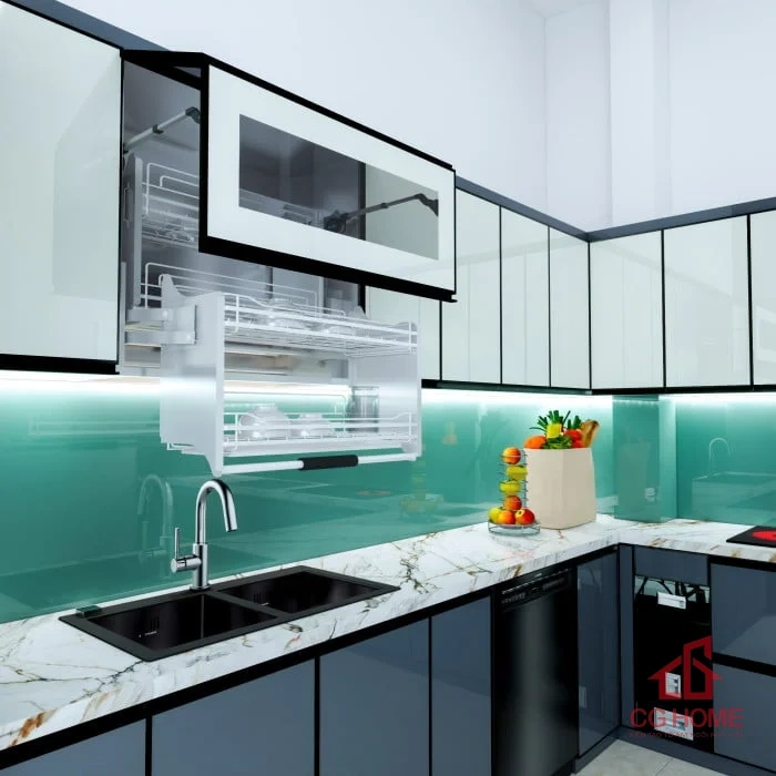 Tủ bếp hiện đại được sắp xếp theo quy trình bếp lý tưởng: Lưu trữ – Rửa – Sơ chế – Nấu – Dọn dẹp. Tủ bếp inox cánh kính Hưng Yên tích hợp phụ kiện tủ bếp như giá bát nâng hạ inox 304, giúp lấy bát đĩa nhẹ nhàng. Kệ xoong nồi 2 tầng và khay chia muỗng đũa giữ đồ dùng gọn gàng. Ngăn kéo ray âm giảm chấn vận hành êm ái, bền bỉ. Hộc tủ đựng rác và máy lọc nước âm tủ tạo không gian bếp sạch sẽ, tiện nghi.