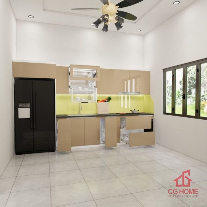Mặt bằng công năng tủ bếp inox cánh acrylic 3.9m chữ I