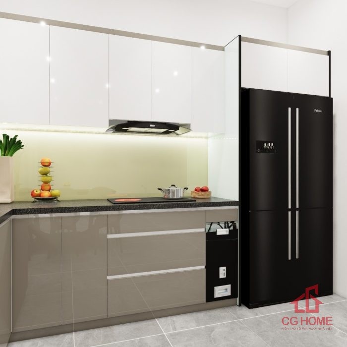 Mặt bằng công năng tủ bếp inox cánh acrylic 4.8m chữ L