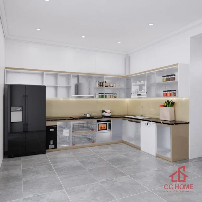 Mặt bằng công năng tủ bếp inox cánh acrylic 6.7m chữ L
