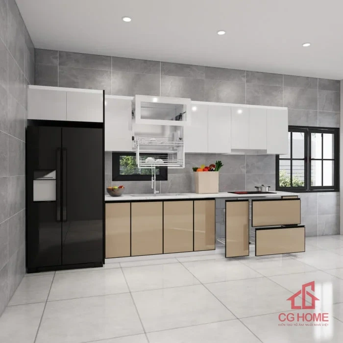 Cánh acrylic tủ bếp cấu tạo gồm hai thành phần. Lớp phủ ngoài là nhựa acrylic, lớp lõi bên trong là gỗ MDF chống ẩm hoặc nhựa đặc.
