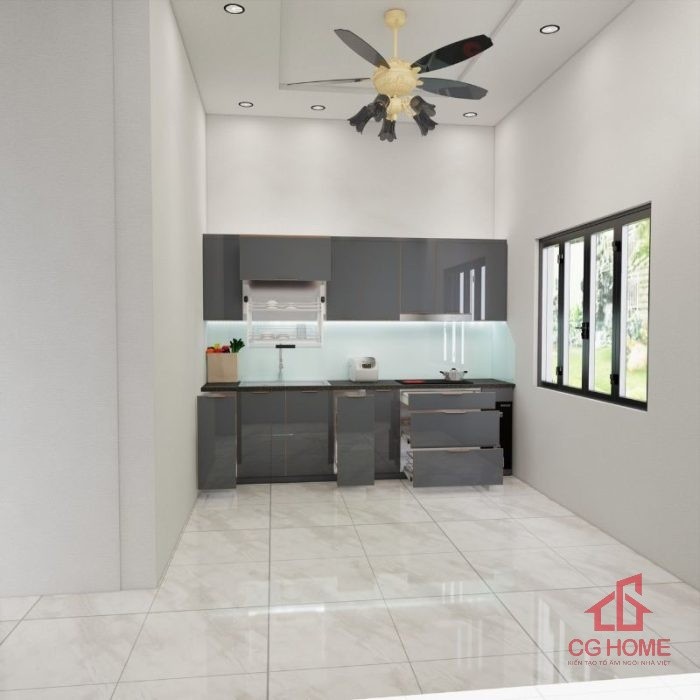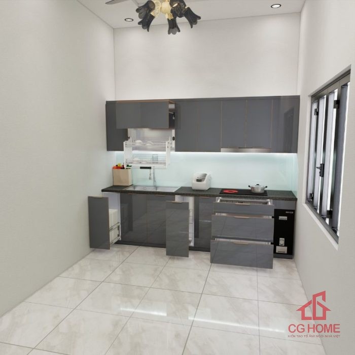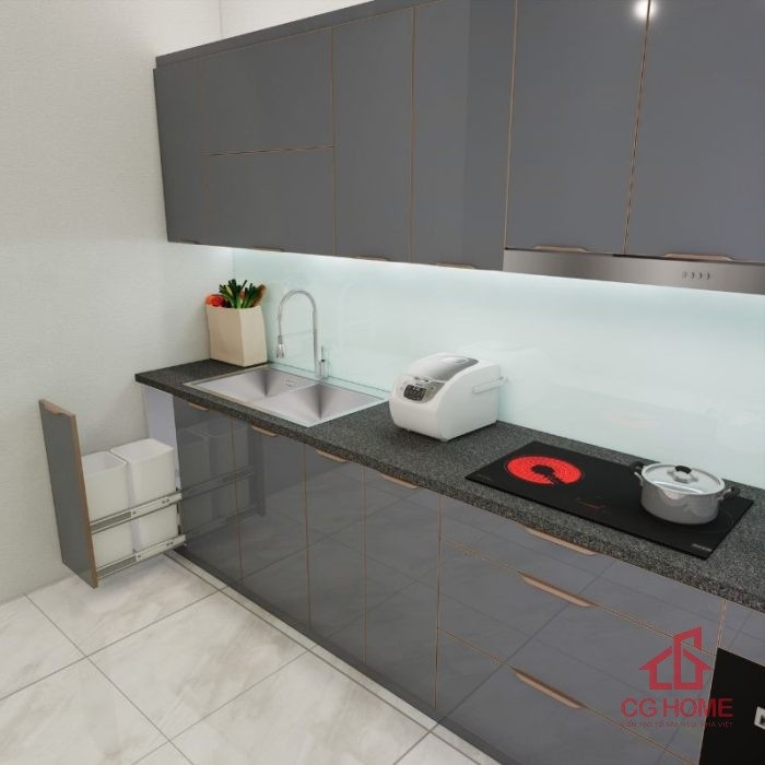 Không gian phòng bếp nổi bật với màu ghi