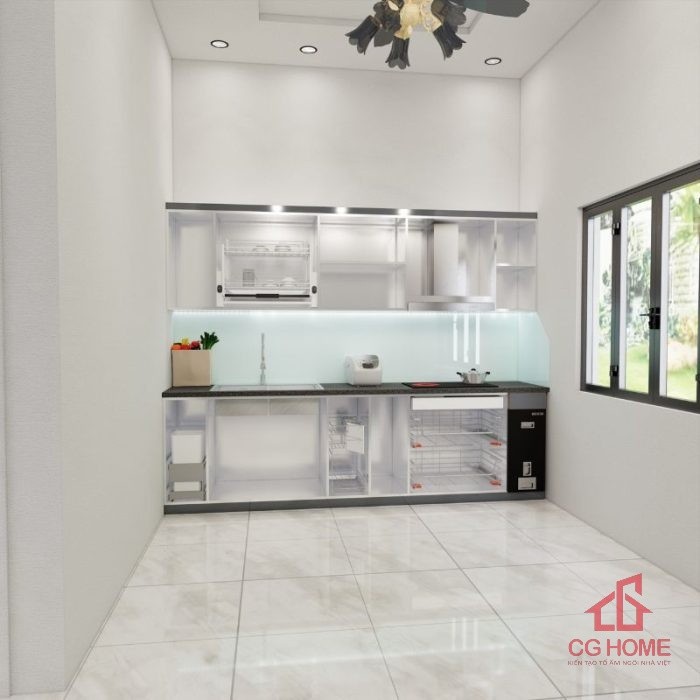 Mặt bằng công năng tủ bếp inox cánh kính 2.9m chữ I