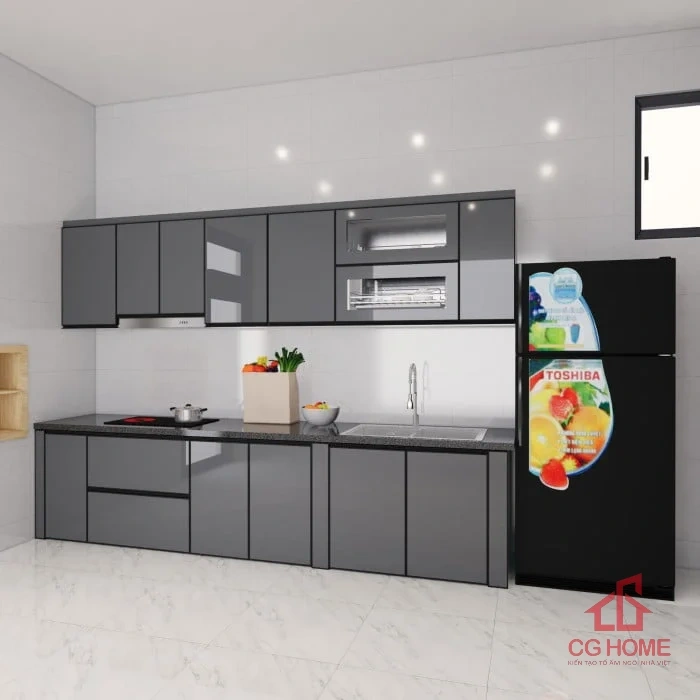 Khung nhôm đỡ kính tủ bếp là một bộ thành phần quan trọng cánh kính tủ bếpChất liệu hhôm nội thất sơn tĩnh điện, có độ bền cao, chống xước, chống ăn mòn và không bị bay màu. Màu nhôm cánh kính tủ bếp phổ biến nhất là màu bạc, màu đồng và màu đen. Khung nhôm cánh kính tủ bếp giúp cố định kính cường lực và tạo độ thẩm mỹ cho cánh tủ.
