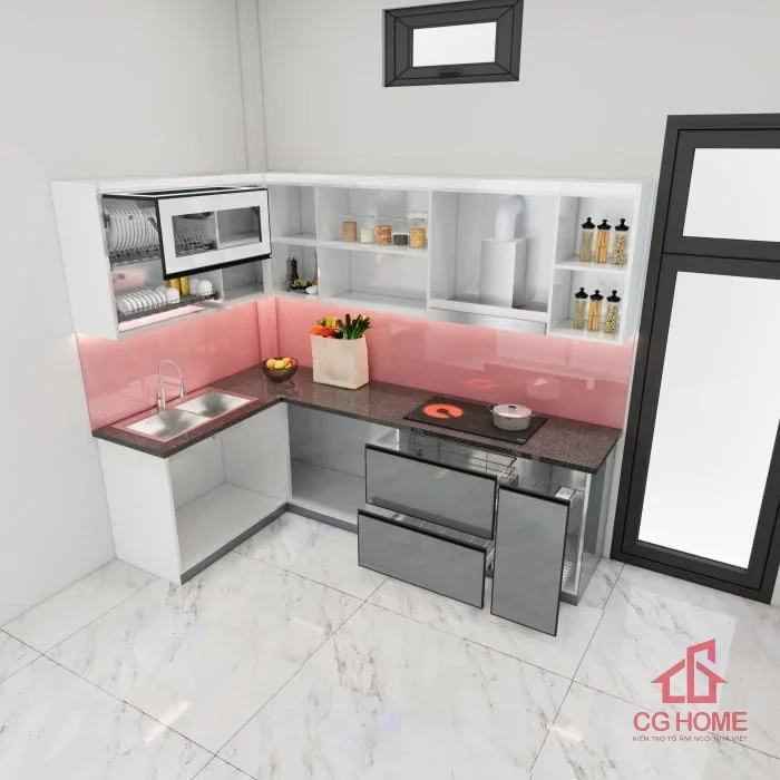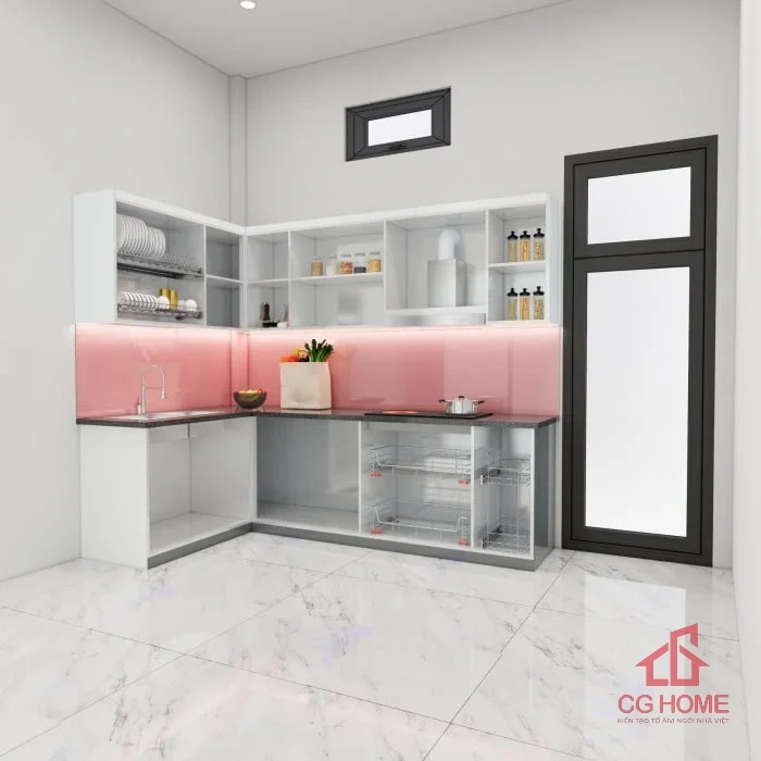 Không gian bếp nổi bật với tông màu hồng