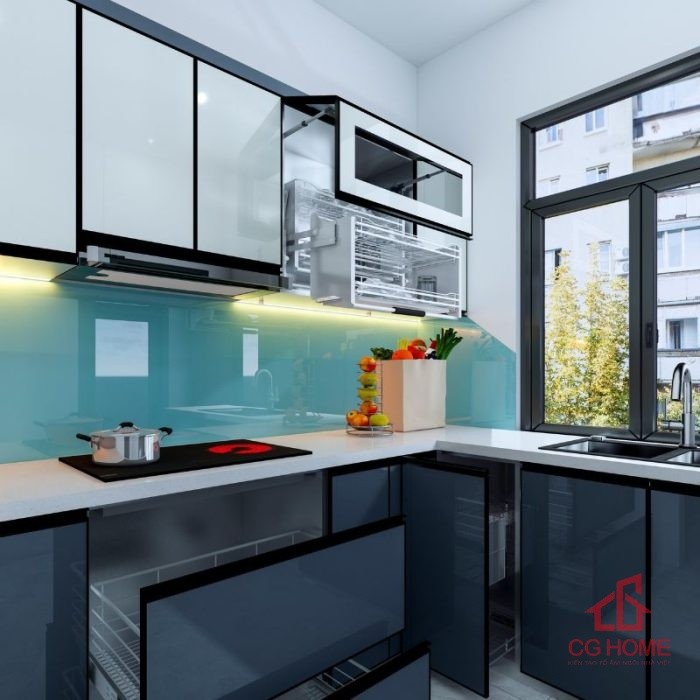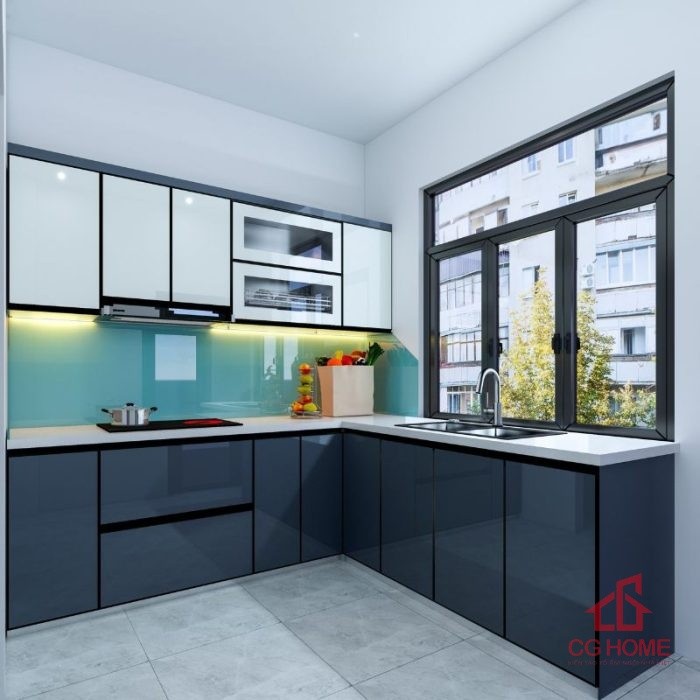 Cánh kính tủ bếp được cấu tạo gồm hai phần. Phần kính cường lực sơn ở ngoài và kết cấu khung nhôm inox đỡ tấm kính.