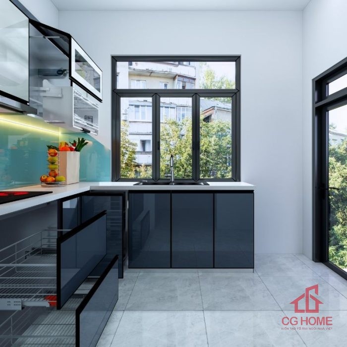 Khung nhôm đỡ kính tủ bếp là một bộ thành phần quan trọng cánh kính tủ bếp. Chất liệu hhôm nội thất sơn tĩnh điện, có độ bền cao, chống xước, chống ăn mòn và không bị bay màu. Màu nhôm cánh kính tủ bếp phổ biến nhất là màu bạc, màu đồng và màu đen. Khung nhôm cánh kính tủ bếp giúp cố định kính cường lực và tạo độ thẩm mỹ cho cánh tủ.