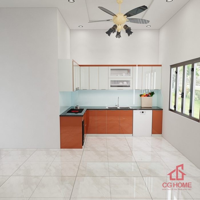 Mặt bằng công năng tủ bếp inox cánh kính 4.7m chữ L