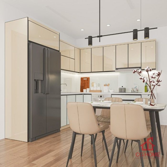 Khung nhôm đỡ kính tủ bếp là một bộ thành phần quan trọng cánh kính tủ bếp. Chất liệu hhôm nội thất sơn tĩnh điện, có độ bền cao, chống xước, chống ăn mòn và không bị bay màu. Màu nhôm cánh kính tủ bếp phổ biến nhất là màu bạc, màu đồng và màu đen. Khung nhôm cánh kính tủ bếp giúp cố định kính cường lực và tạo độ thẩm mỹ cho cánh tủ.
