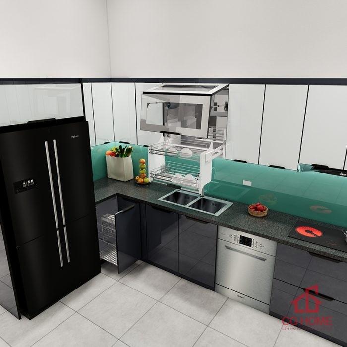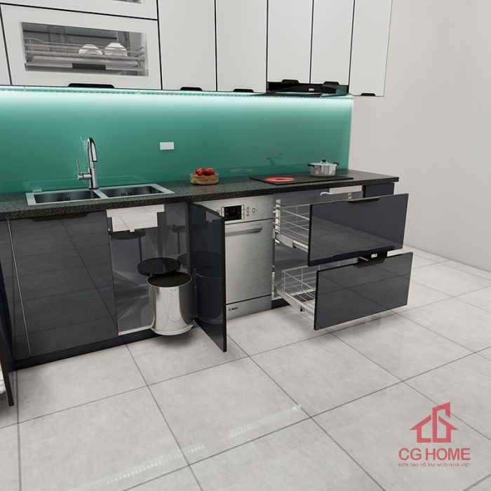 Tủ bếp với đầy đủ phụ kiện và cả khoang máy rửa bát