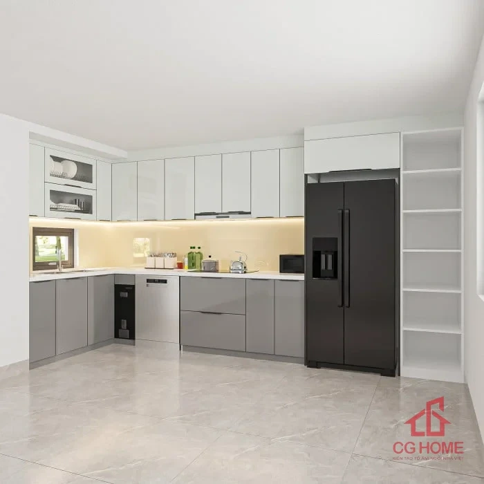 Tủ bếp với tông màu sáng làm nổi bật căn bếp